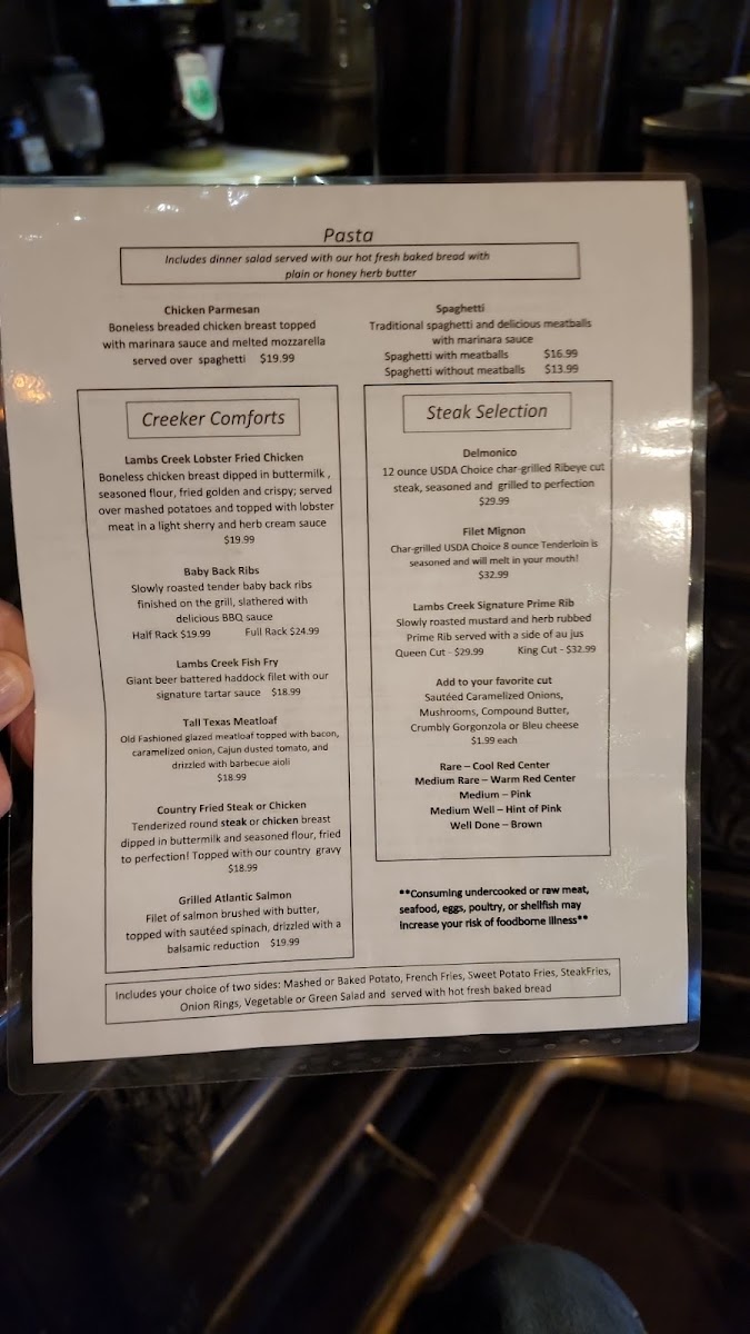 For those looking for comfort food, the Creeker Comforts section is a must-try, with standout dishes like the Lambs Creek Lobster Fried Chicken, tender Baby Back Ribs, and their famous Lambs Creek Fish Fry. The Tall Texas Meatloaf and Country Fried Steak or Chicken are also excellent choices that will remind you of home-cooked favorites.